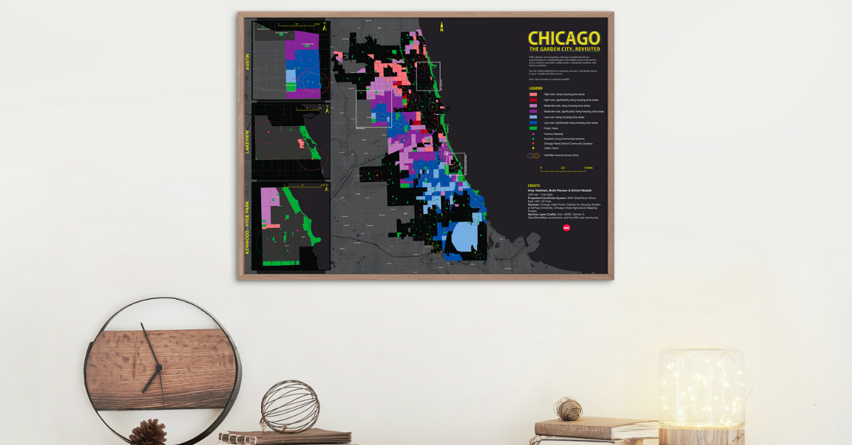 The project displayed the spatial relationship between “green amenities” of public parks, farmers markets, urban farms, and assisted living community gardens and Chicago community areas experiencing levels of displacement and marginalization. The map is the culmination of a quantitative-to-qualitative process from citywide patterns to case studies in Austin, Hyde Park-Kenwood, and Lake View neighborhoods. The work is an exercise in Geographic Information Systems, using original and recreated data translated into visual layers.