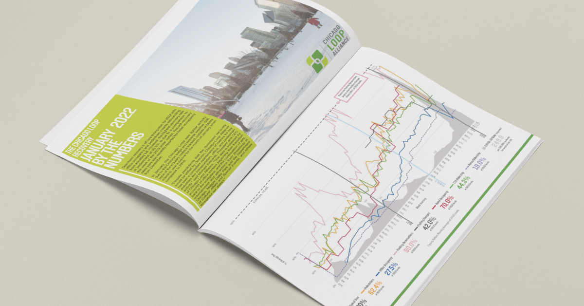 This deliverable is a monthly publication on the Chicago Loop’s economic recovery from the impact of the COVID-19 pandemic. Data for pedestrian activity, office occupancy, CTA and Metra ridership, parking reservations, and hotel occupancy are collected, analyzed, stylized and presented to the business community. Involving quick turnaround and team collaboration, the reports are enhanced by quotes from industry professionals and frequently picked up by media.