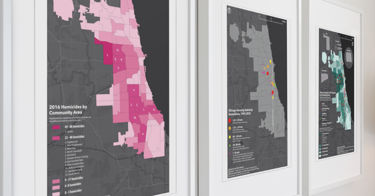 Completed through a special research assistantship, the series of maps describe the impact of Chicago’s municipal decisions that discriminatorily targeted BIPOC neighborhoods. Centered around the Plan for Transformation, six maps showing the spatiality of homicides, Chicago Public Schools closures, Chicago charter school locations, Chicago Police Department districts, Chicago Housing Authority demolitions, and an amalgamated map each contribute to the scholarship of criminology, law, and justice.