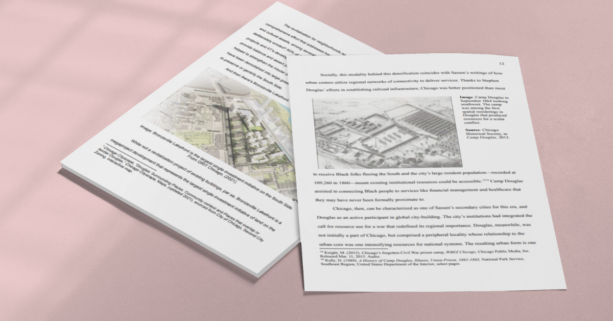 The analytical writing of these two essays deconstructs the Douglas, Chicago, Community Area, first by applying a Global Cities framework to the neighborhood, and second, by critiquing the existing institutional initiatives for its land use. Planning theory is the primary vehicle describing urban spatial form that explores the racialized political economy in Douglas. In the second essay, Black development is juxtaposed against institutionalized urban renewal, leading to a determination about community planning.